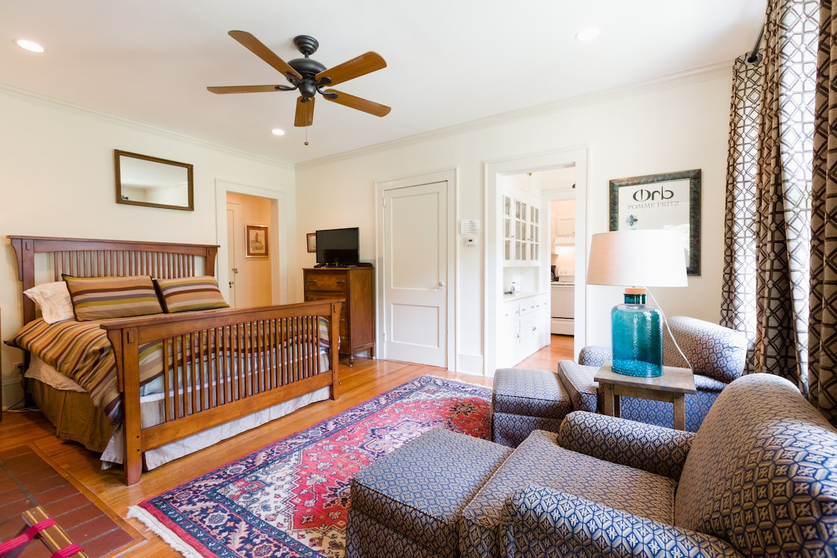 This airy and bright carriage house studio is nestled on a quiet street in the heart of Virginia-Highland, one of Atlanta's most popular neighborhoods. Just blocks from Piedmont Park, Atlanta Botanical Gardens, the Beltline, Ponce City Market, and many restaurants and bars. Only 2 miles from the Emory, Georgia Tech, and Georgia State campuses. This studio apartment has a queen-sized bed, bathroom, large desk, and sitting area with a coffee maker, refrigerator, and microwave.