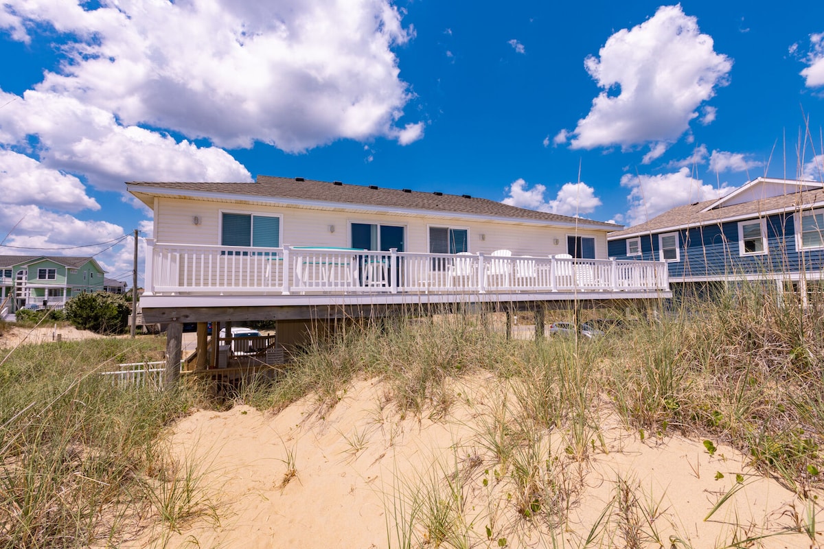 LESS THAN 1 MIN WALK TO WATERS EDGE. Fantastic beach home with 3 bdrms, 3 baths, Living room-dining rm combo with vaulted ceilings, kitchen, TV in 4 rooms, Wi-Fi, large deck with natural gas Weber grill, Washer-dryer. Great water views while you are relaxing on the deck. Many amenities! Just bring your bathing suit. Our guests have all said they love this place! Very close to many wedding venues, restaurants, state park, oceanfront boardwalk is closeby, military bases, etc.