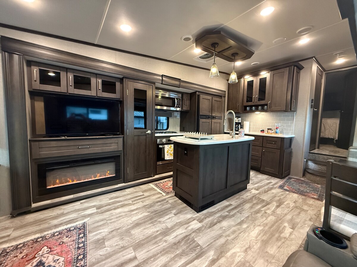 We love our tiny home and everybody that stays loves it too! There is a spacious living room and kitchen area. It has a full bath with tub, a bedroom with a queen size bed, closet, dresser and TV. The home provides essentials for your stay. Just bring your food and clothing. It has a front porch with chairs to enjoy the cooler evenings. It is a short walk to resort amenities, including pool, fitness center and laundry facilities. High speed internet is also available.