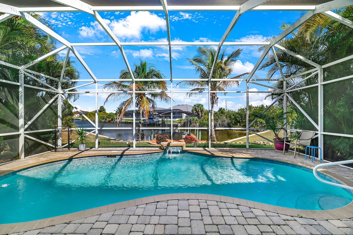 Book our well maintained, heated pool home with vaulted ceilings in beautiful SE Cape Coral! Just a 10 minute drive to downtown, Sun Splash waterpark & a few minutes to shops, restaurants and the eco preserve. Less than 35 min to Ft. Myers beach & Sanibel. The luxurious new furniture, fire pit table, lush and colorful yard, and the redone heated pool w/ vase fountain provides an amazing experience! INCLUDED FOR FREE ✔️ Fast WiFi ✔️ Coffee and Tea ✔️ All kitchen utensils ✔️ Beach Towels & more
