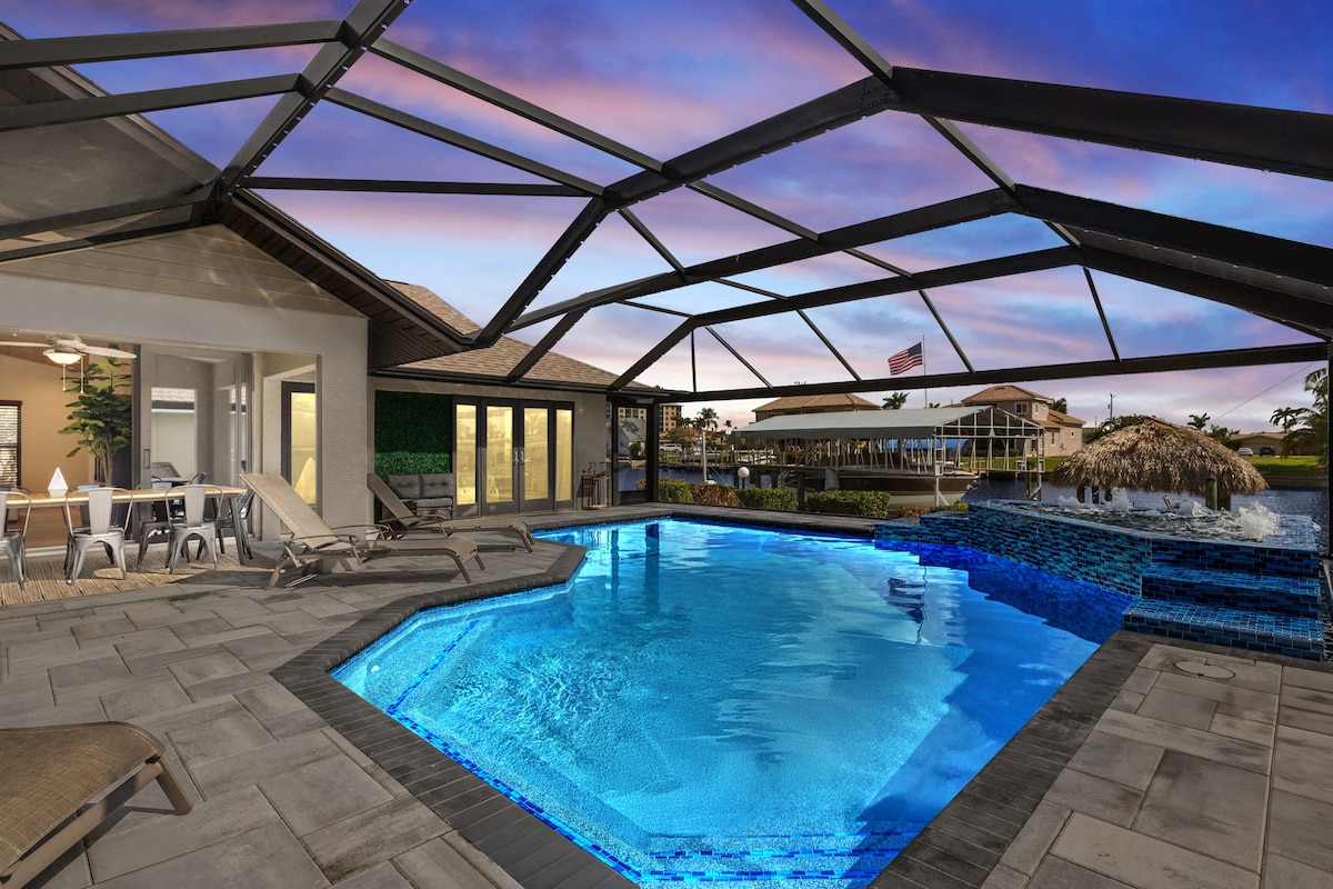 -All you need private retreat, 1 mile to downtown Cape Coral, 20 min to downtown Fort Myers & 25 min to Sanibel -Canalfront with heated pool & infinity-edge spa -Steam shower & spa-style toilets for a touch of pampering -Putting green & kayaks for outdoor family fun -Jet ski lift & 55’ boat dock—bring your water toys! -4 bikes for exploring the neighborhood -Garage gym -Tiki hut & outdoor lounge for family hangouts -Game room with pool table, shuffleboard, piano & karaoke—endless entertainment!