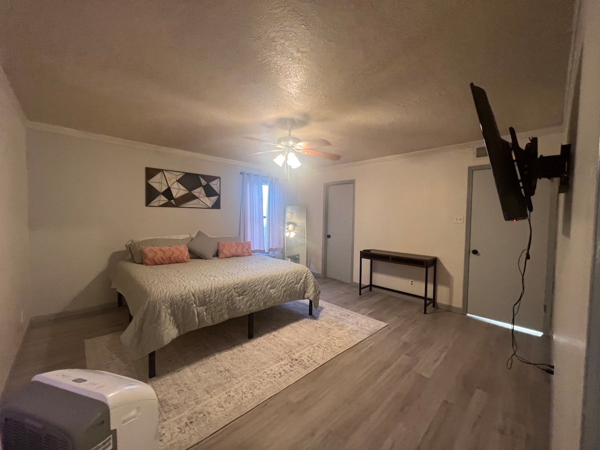 1 bedroom -Queen bed, 1 bath, couch, kitchenette, courtyard. Brand new 55" smart TV, high speed Wi-Fi. Studio located in West El Paso close to I-10. The Kitchenette is equipped with refrigerator, microwave, convection toaster oven, coffee maker, double burner electric cooktop, blender, 2 slice toaster, cooking ware, plates, cups, glasses, silverware, etc. High chair and pack'n play are available upon request.