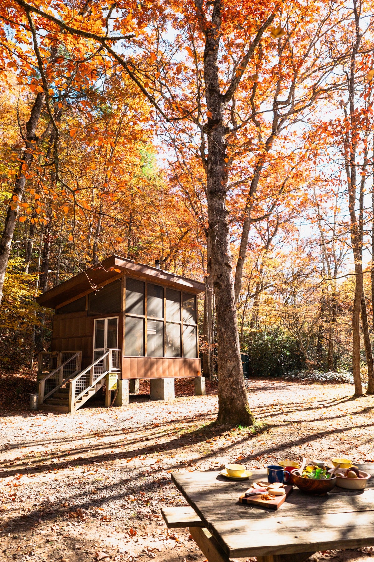Creekside A-frame Treehouse in nature tucked amongst the trees in the scenic mountain town of Blue Ridge, Georgia. This treehouse is tiny home perfect for nature lovers, couples or solo adventurers. Inside this tiny cabin you will find custom construction with reclaimed wood from a 100 year old furniture store with rustic and modern charm. Outside, you will be greeted by the babbling of Fightingtown Creek, a large sunken hot tub overlooking the creek and a firepit under a canopy of stars.