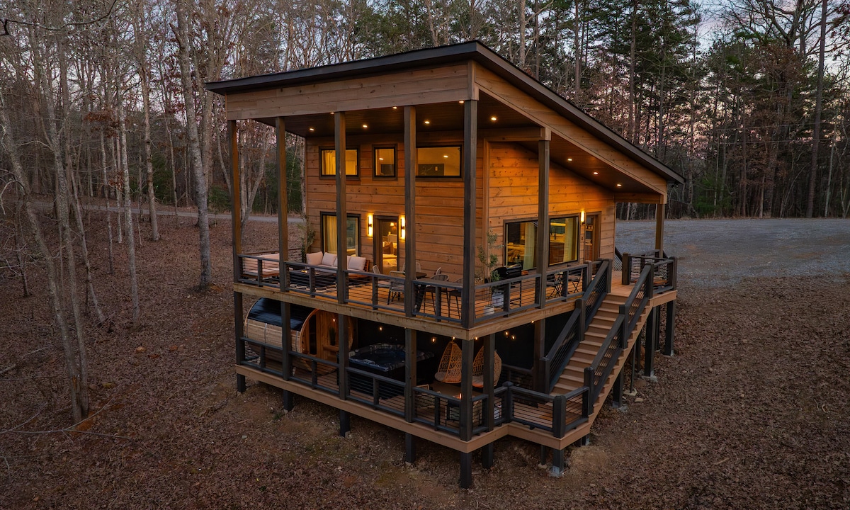Relax in this peaceful and private modern space. A quick drive from the city and you've arrived at this escape from the hustle and bustle. Yet when the mood strikes for great restaurants, trendy bars/breweries, and unique small-town shopping you're only minutes away from downtown Blue Ridge. In this completely updated cabin you'll experience total privacy in the indoor hot tub, gorgeous screened in porch with swing bed and tv, huge walk-in shower, serene firepit, new grill & firepit table.