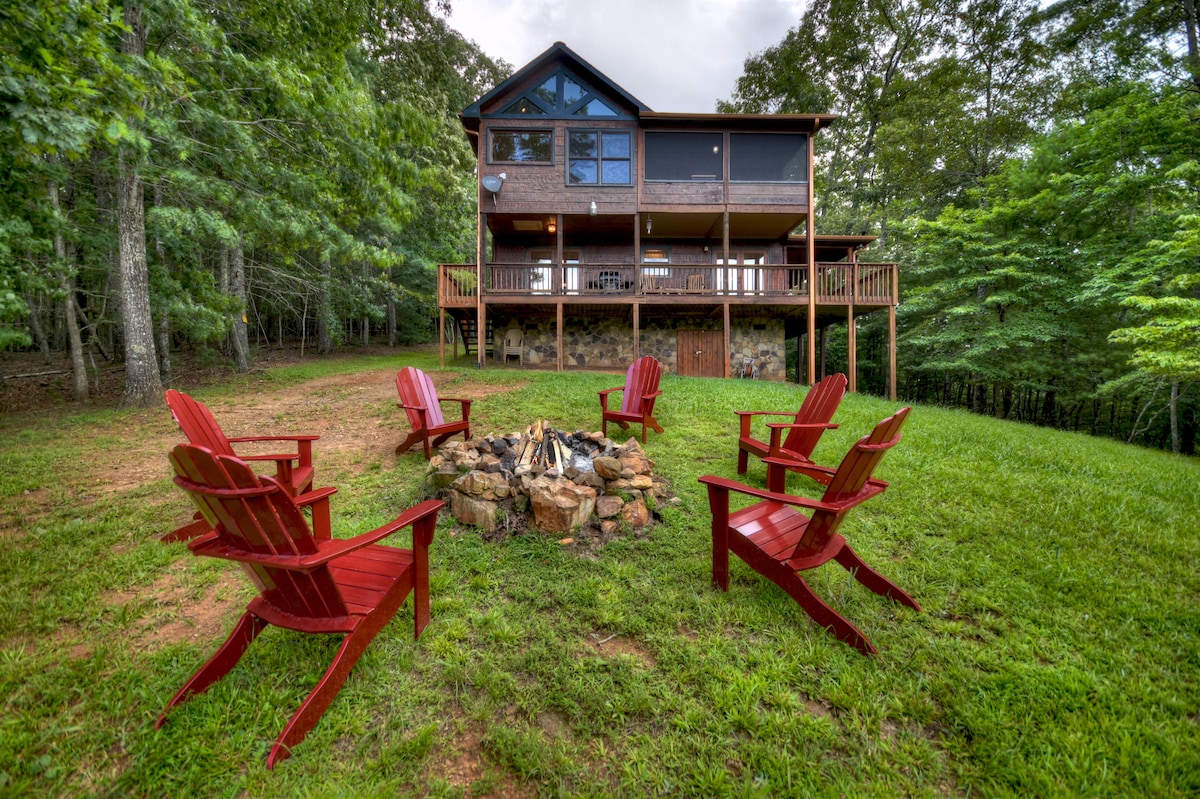 Enjoy lake and mountain views in this updated oasis amongst the trees. Whether you're looking for an outdoor adventure or a rejuvenating escape, we have it all! Situated on a five acre lake, enjoy the private dock and use of our two paddle boards and canoe. After a day of hiking, decompress in the hot tub and sauna. Tons of space to gather both indoors and outdoors, we hope you'll enjoy all the modern amenities while reconnecting with nature. Just 12 minutes to downtown Ellijay!