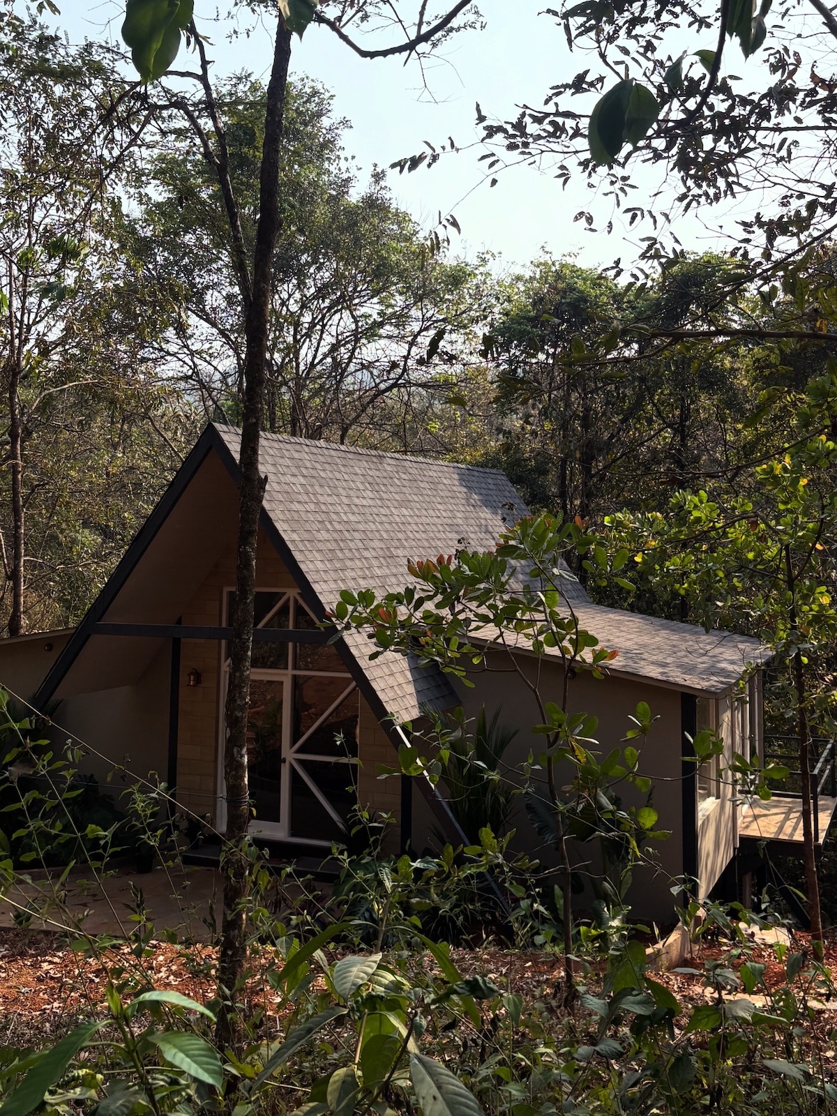 Another HNH masterpiece- This chalet is located inside a resort at Saipem which is a hilltop neighborhood in North Goa on the outskirts of Candolim. It offers a blend of serene, elevated living with proximity to the coast, situated near river streams and lush green surroundings. Saipem is a distinct part of this area that provides a quieter, more secluded experience compared to the more bustling parts of the beach yet a mere 7 minutes drive to candolim beach.