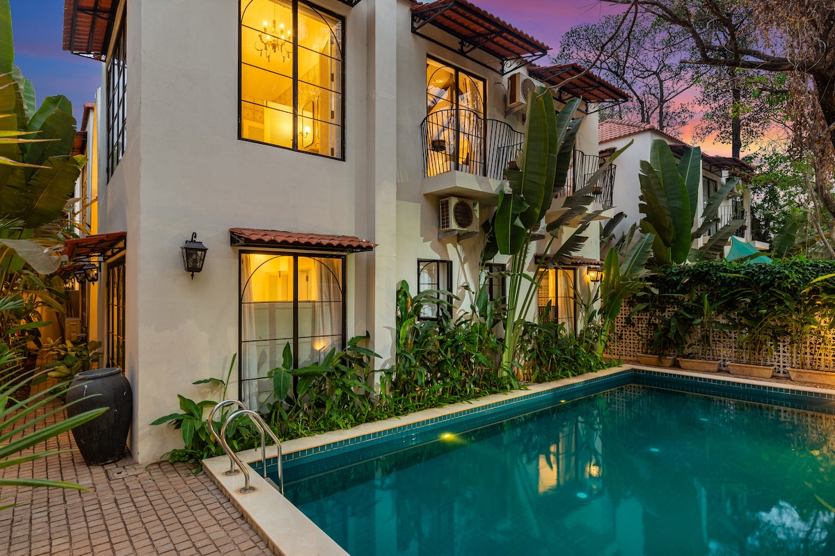 "Sunsaara Poolside Villa” Exquisite, Elegant sun-drenched & east-facing. The spacious living area exudes an air of exclusivity, with plush furnishings and tasteful décor that seamlessly blend comfort and style. Pristine crystal-clear pool is surrounded by a lush green lawn. When the sun sets, the villa transforms into a haven of romance. The villa's east-facing orientation means you'll have a front-row seat to the stunning sunrise each morning and the moonrise at night with a candlelight dinner.