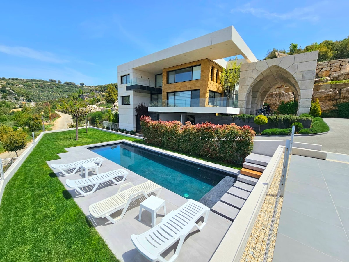 • Exclusive luxury villa in the serene Bchaaleh area of Batroun 🌄 • 6 spacious bedrooms, ideal for families, groups & special getaways 🛏️ • Expansive living areas designed for comfort and elegance ✨ • Private pool and garden with beautiful sea views 🌊🏊♂️ • Peaceful setting with privacy and relaxation 🌿 • Minutes from Batroun, Jbeil & Douma souks for easy exploring 📍