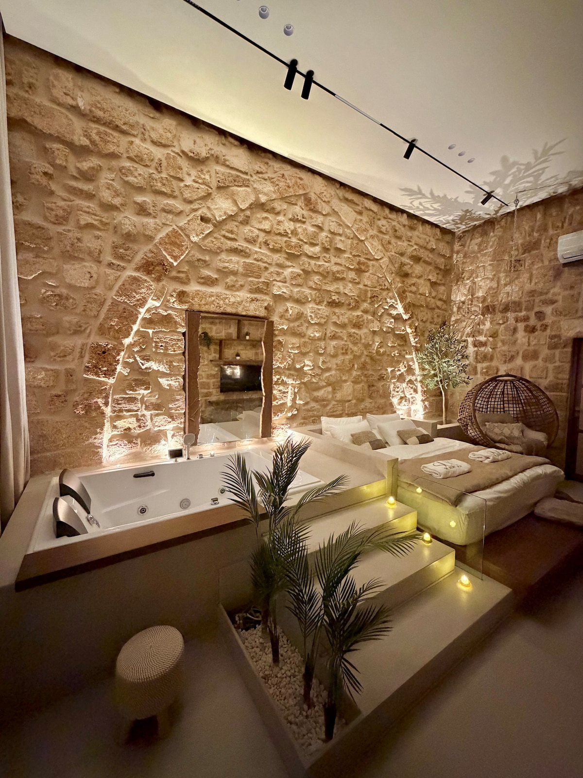 Stay in the heart of Batroun’s vibrant Old Souks in this luxury designer suite featuring a private indoor jacuzzi. Surrounded by cafés, restaurants, nightlife, and historic streets, everything is within walking distance. The space blends authentic Lebanese stone architecture with modern comfort, offering a king-size bed, cozy lounge area, Smart TV, Wi-Fi, AC, and a semi-equipped kitchenette for a stylish and relaxing getaway.