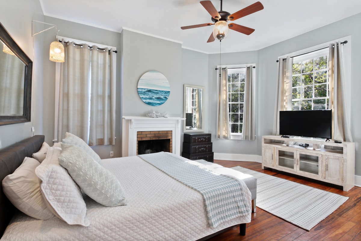 Stay directly on Forsyth Park — not “near” it, but truly steps from it. Walk out the door, cross the street, and you’re instantly in the Scented Garden; the iconic Forsyth Fountain is just one block away. This is the most authentic Forsyth Park location you can book Circa 1898 Victorian studio with 12-foot ceilings, a romantic king canopy bed (Tuft & Needle), and beautiful heart pine floors. Enjoy blackout curtains, a full bathroom with tub/shower, and a cozy full kitchen.