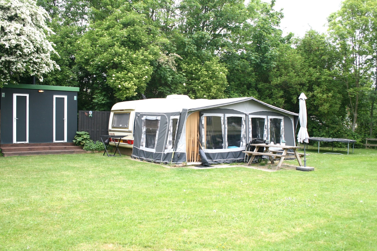 De caravan staat in een grote privétuin met weids uitzicht waar u in alle rust en vrijheid kunt genieten van uw vakantie. In de voortent is de woonkamer met TV en de eethoek. In de caravan 2 x 2 pers opgemaakte bedden. Een 3 pits gasstel, magnetron, pannen, servies , hand/theedoeken, waterkoker+ Senseo incl koffie/thee , koelkast/vriesvak en airco Direct naast de caravan vindt u de douche/extra toilet Er liggen handdoeken voor klaar. Bij de caravan staat een trampoline, schommel+ glijbaan.