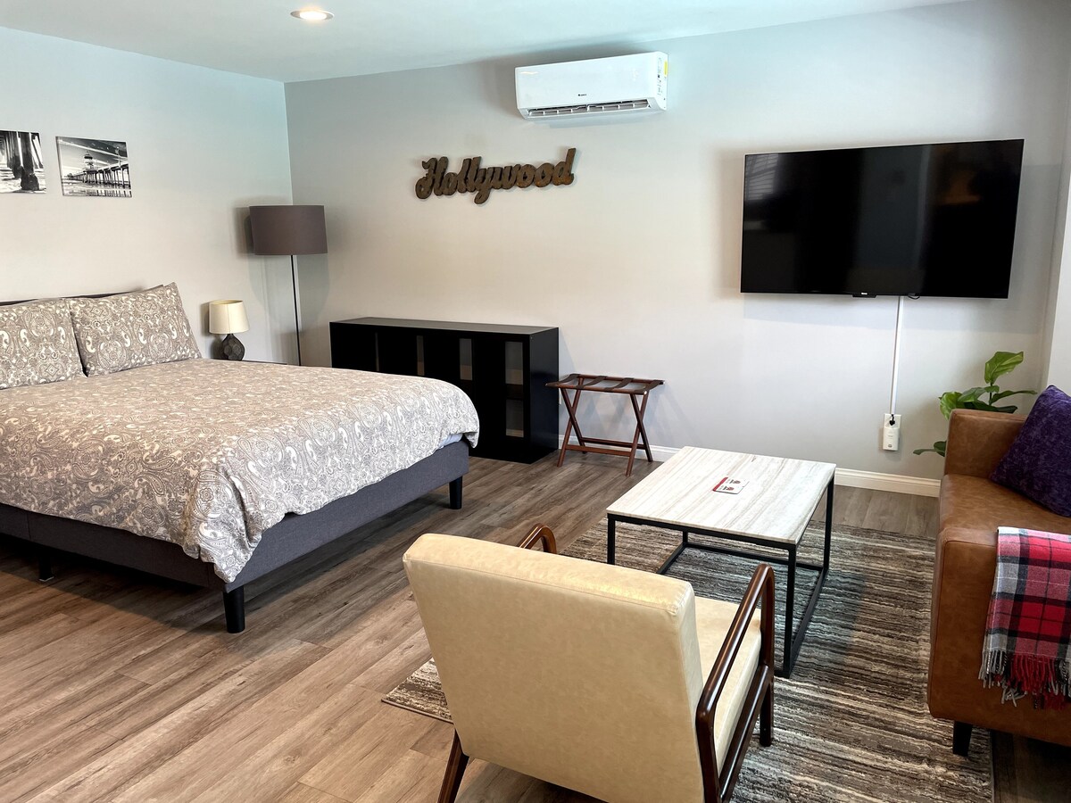 Getaway to this private guest house conveniently located in Hollywood’s backyard. Located within the city of Burbank, home to the major studios. Covered with bamboo, the Green House is a private pool house. The updated Green House features a kitchenette, private bathroom, 50” smart TV, and a queen size memory foam mattress. Either enjoy the Green House or take a quick drive to Universal Studios and the other must see landmarks LA has to offer. EV charger available.