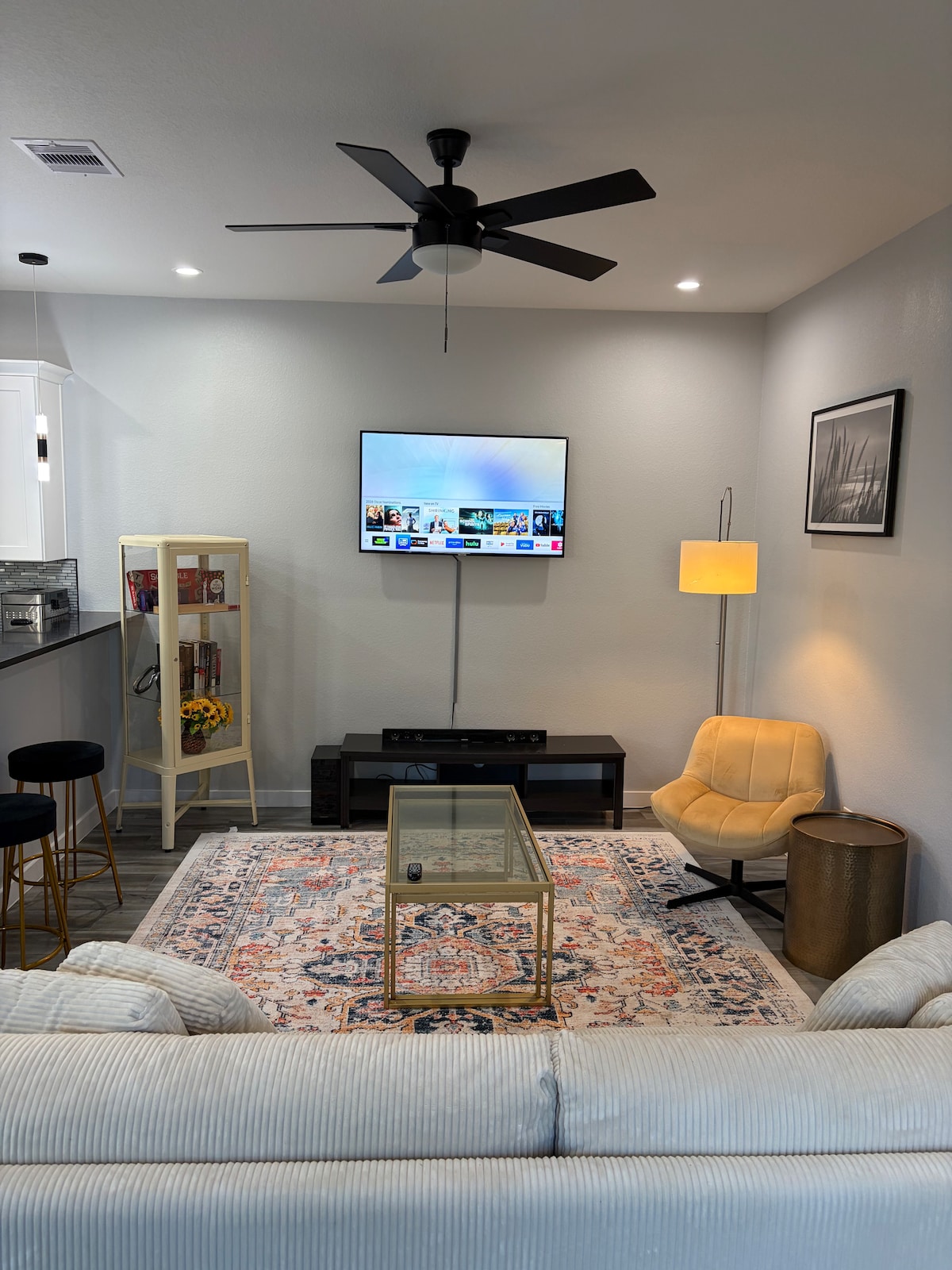 Experience luxury in this Houston townhouse with 3 bedrooms, each with a private bath/TV. The smart home has automated locks, lights, vacuums, and thermostats. The 2nd floor is an open-concept space with a kitchen, dining, and living area featuring an 85" Samsung TV, pool table, board games, and mini bar. There’s a small workstation in the downstairs bedroom and an office space with a full work setup. Enjoy the backyard seating area. Located under 5 miles from NRG Stadium and Minute Maid Park.