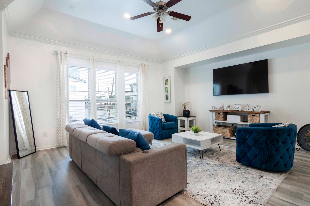 Perfect for groups or families, this modern and elegant townhome comfortably hosts up to 10 guests. With 3 spacious bedrooms, 3.5 baths, and 5 beds, it offers plenty of room to relax and unwind. The open-concept living area is stylishly furnished, creating a welcoming space for everyone to gather. Located just 5 minutes from downtown Houston, you’ll be within walking distance to the best restaurants, bars, and entertainment the city has to offer.