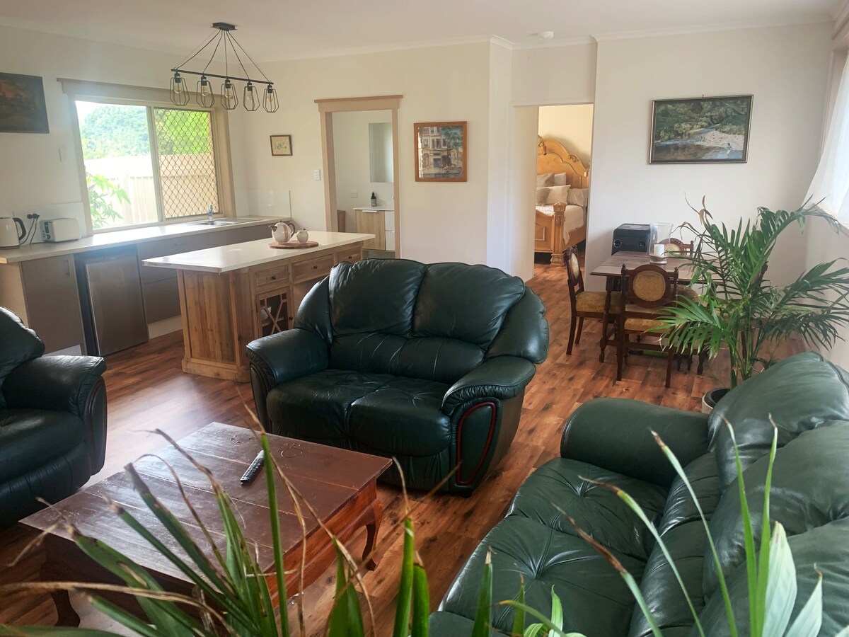 Private and spacious room offers a queen bed, kitchenette and sofa with an accessible bathroom. Outside the patio overlooks bush land and Burnett River with seating and bbq. 10 minutes to shopping centre and restaurants, 15 minutes to Bundaberg CBD. Please note there is NO Wi-Fi, but we have Telstra and Optus reception and you can hotspot to the TV for streaming services. We do not allow dogs onsite, this is for their own safety as our property is not fully fenced.
