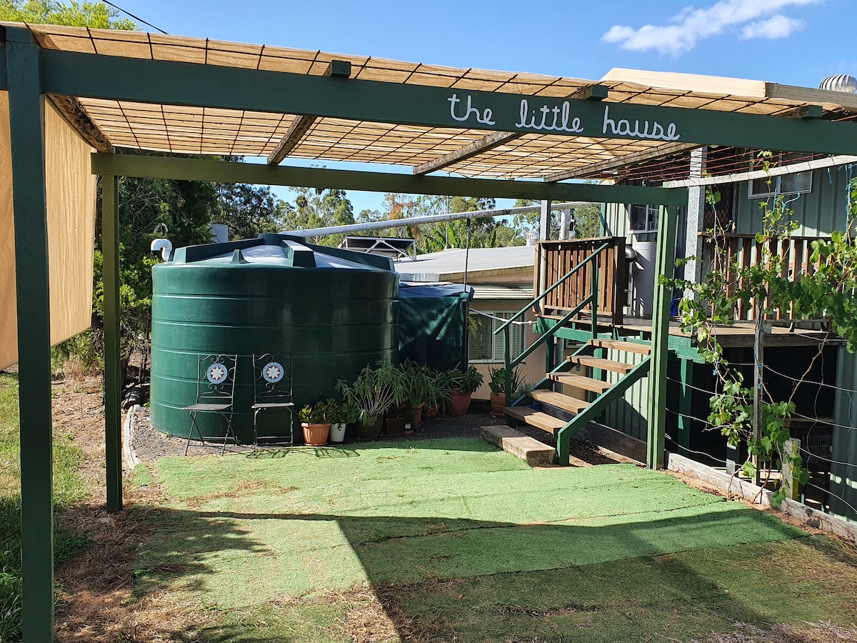 Our Little House has an open plan living and bed/s space with a private bathroom and kitchenette. A number of stairs lead up to a small patio where the unit is located and there is plenty of space to park vehicle/s. Our homely Bnb is on our mango farm and all water used is rainwater. The birdlife is prolific and you will wake up to a morning chorus. There are plenty of gardens to view and starry skies at night. Guests will be warmly welcomed and left to relax and enjoy the country charm.