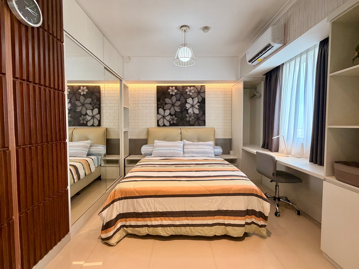 Cozy & Inviting Stay with city view in a Prime Location! Stay in this comfortable 2BR apartment on the 19th floor, ideal for couples, families, travelers, or business trips. Conveniently located next to Mall of Indonesia, where you can dine, shop, or enjoy a movie. • Common swimming pool for relaxation • Fully equipped kitchen for home cooking • Free Wi-Fi & TV cable for entertainment • Complimentary drinking water & essentials Enjoy a pleasant stay with great service at a fantastic value!