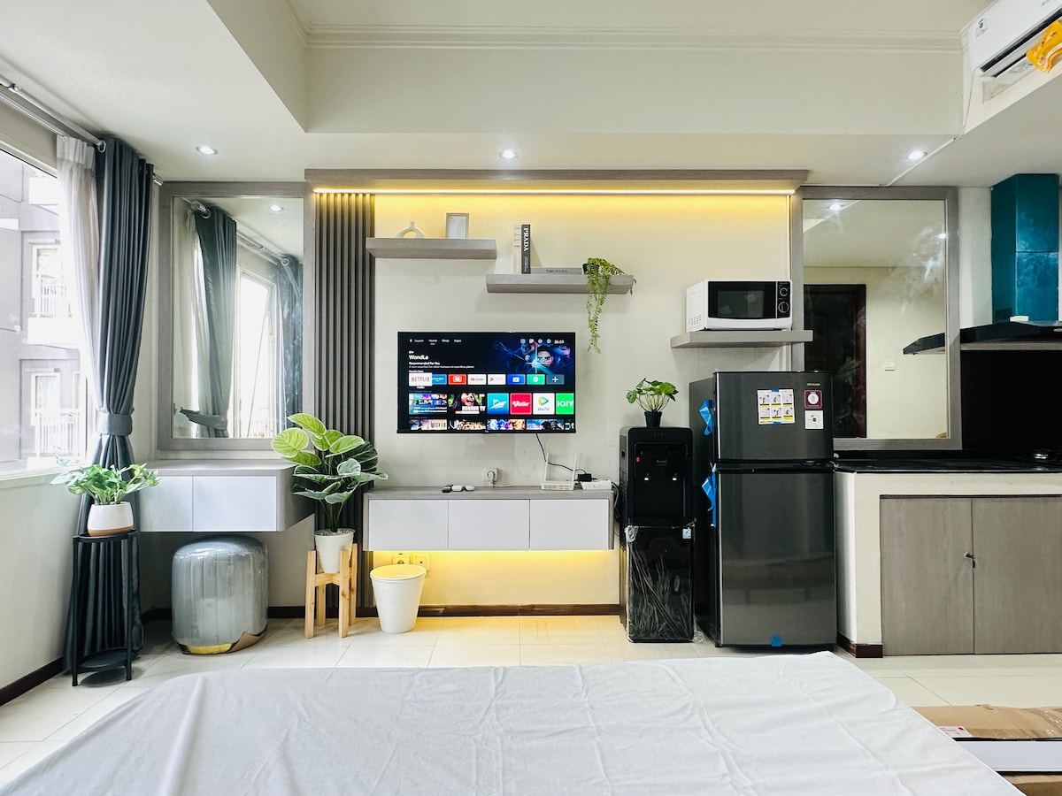 This cozy and stylish studio (approximately 18–21 sqm) is located in GreenBay Apartment, North Jakarta. The apartment is directly connected to Baywalk Mall and provides easy access to a scenic sea view area. You'll find plenty of local restaurants nearby, many of which offer direct delivery to your unit for added convenience. For recreation, the pool, gym, and basketball/tennis courts are available in the public area with scheduled access.