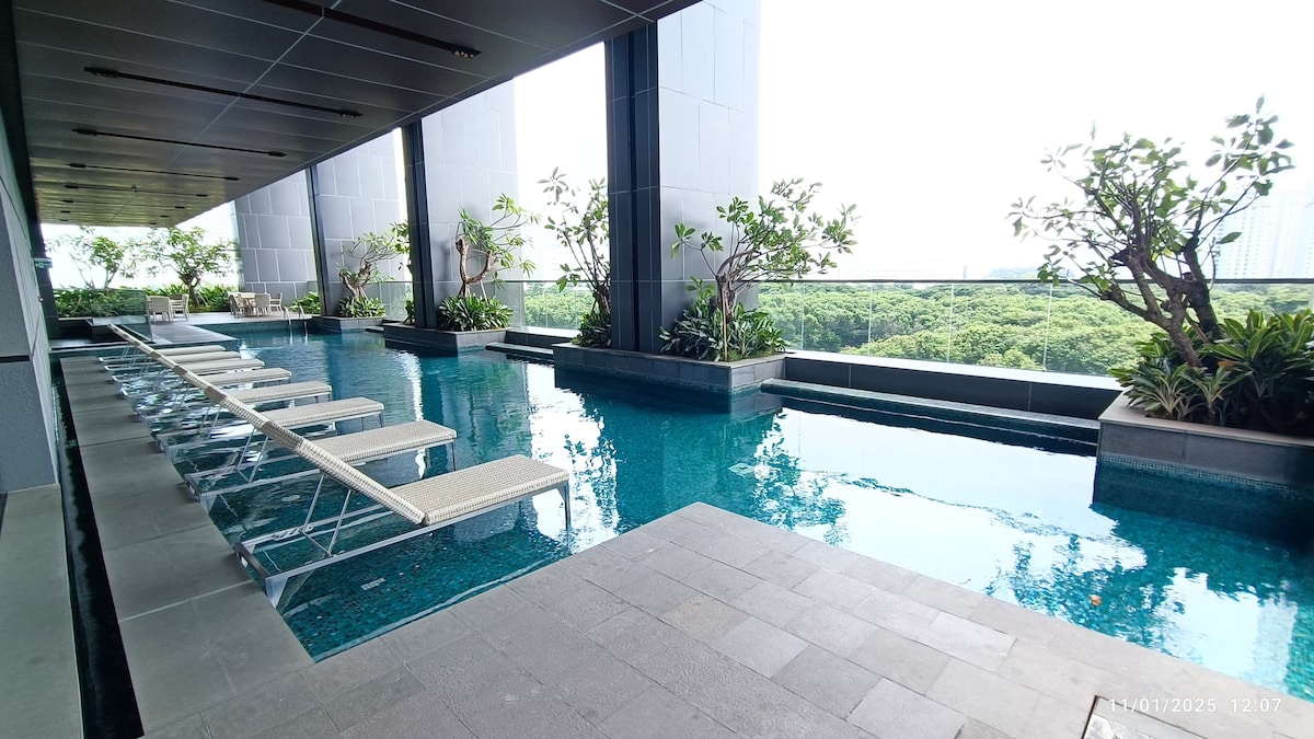全新 1卧室(非开间)日式侘寂风公寓(35㎡),可欣赏城市景观,位于雅加达 Menara Jakarta 的 K Mall 楼上,距离 JIExpo Kemayoran 仅150米,步行约5分钟。地处雅加达市中心,11分钟到 JIS,20分钟到 Grand Indonesia,5分钟可上高速。公寓配备 Queen Size 床(160×200)、2台空调、WiFi、小厨房、50英寸 Google TV、浴室与厨房热水器及洗衣设施。可使用泳池、健身房、休息室、共享办公区、运动场及儿童游乐场。适合 2位入住。
