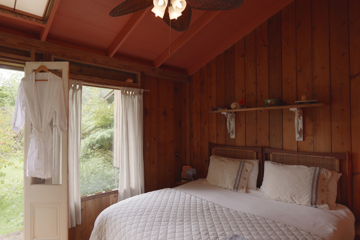Warm, grounded, and welcoming — the Heart Room invites soft landing and gentle connection. Close to shared spaces and garden paths, it’s ideal for those who appreciate community energy and cozy comfort. Your own sanctuary within the Sanctuary — a private room with its own entrance into vibrant tropical gardens. Surrounded by greenery, you’ll find quiet moments of reflection and renewal. Step outside and you are already in the heart of the land, welcomed by the spirit of Aloha in every breath.
