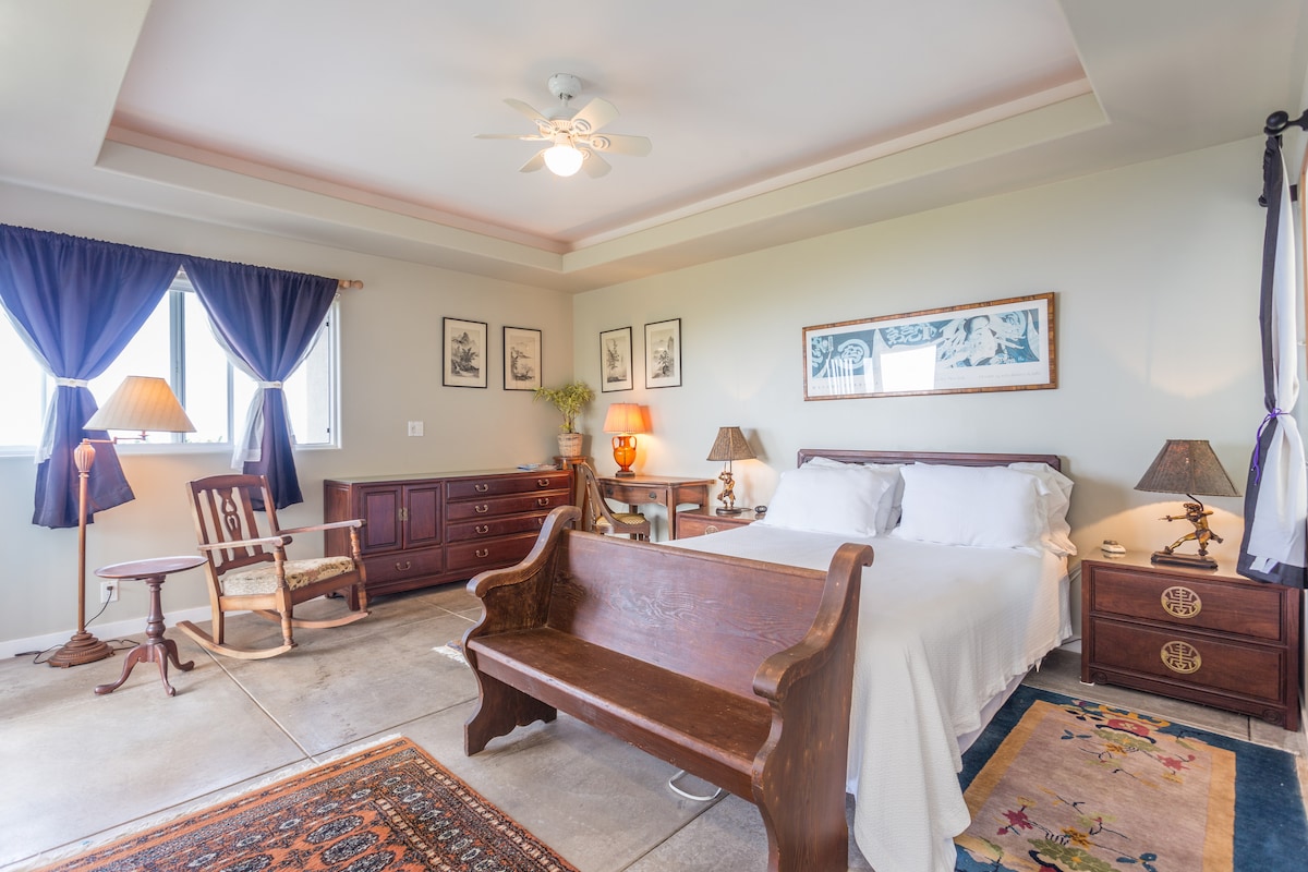Beautiful, peaceful, jungle vibes, surrounded by nature, 15 min from the center of Kona, up on the mountainside, lush lot w/ fruit and mac nut trees! The ADULTS-ONLY space has an open floorplan, with high ceilings and lots of room. Luxury memory foam King bed, two front lanais, nice Weber grill, big Samsung TV with cable, Wifi, shared washer and dryer, and a great kitchen with all the amenities. Also: beach towels, chairs, cooler, & umbrella! This Private space is the largest unit of the home.