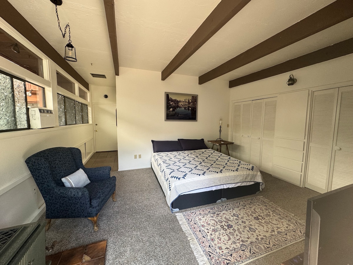 Cute 2-bedroom, 1-bath house. Vintage bohemian meets modern. Hardwood floors, deck with a view, private/fenced yard, washer/dryer, natural light, downtown (5 min. walk). Dream location. Note: the extra bedroom is accessed via the outdoor stairway (please refer to the floor plan image). Amenities include high-speed private internet, two king beds, soft bedding/towels, Apple TV, a walk-in closet, luggage racks, a work desk/chair, and an EV charger. No pets (including service animals- allergic).