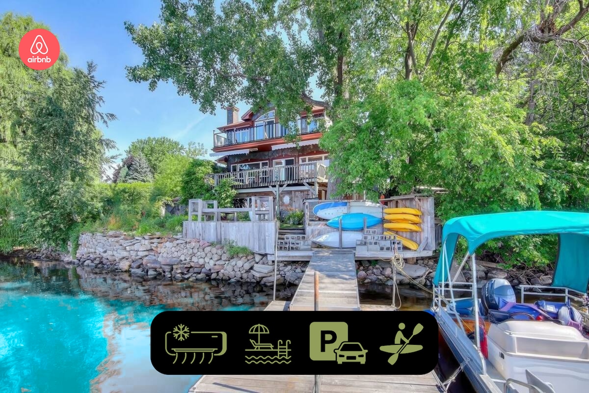 Le chalet Le ptit bonheur est situé en bordure d'un magnifique canal donnant une superbe vue sur le lac St-François à St-Anicet. Spa à l'année , pêche, 2 kayaks inclus,piscine chauffée et grande baie au bout du canal avec possibilité de baignade. Peut recevoir une embarcation. Bateau et sea doo non disponibles!Descente à proximité. Plage à 2 minutes en bateau. Parfait pour de belles vacances familliales. Secteur résidentiel terrain de 11 000 pc Wifi gratuit No CITQ 303012 exp 2025-09-30