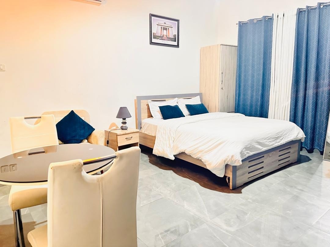 Discover tranquility in this stylish Adenta studio apartment. Nestled in a serene private compound in the Adenta Municipality, Ghana, this space offers a calming retreat. Just 25 minutes from Kotoka International Airport, it boasts a fully air-conditioned setting with an en suite bathroom, dining/workstation area, and a well-equipped kitchen. Enjoy complimentary wireless internet and explore the convenience of this cozy haven.