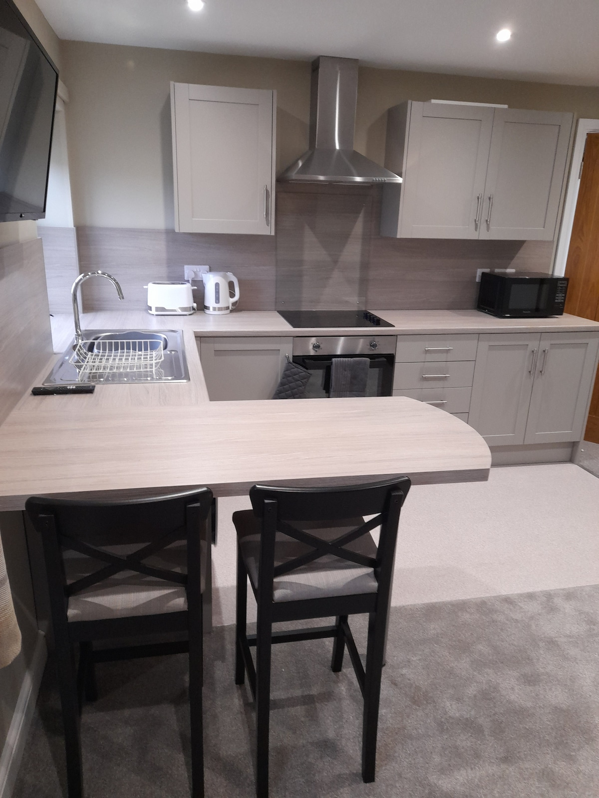 Self contained apartment comprising of double bed, furniture and TV The kitchen is stocked with all crockery & cutlery, microwave, electric oven, fridge as well as a combined washing machine and dryer. A spacious shower room with large dressing area The apartment can be cleaned & serviced weekly if required at an extra cost. Free WIFI and parking included The whole apartment is self contained and exclusive to you with its own access door.