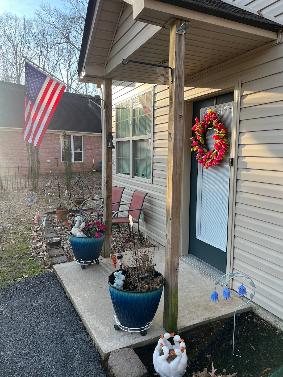 Quaint quiet cul-de-sac centrally located. Perks include secluded covered outdoor area and a loaded breadbox. BR #1 TV and half bath, and a massage chair in BR #2. 20 minutes from airport, ROKU Netflix, Prime and local channels. Guests use personal codes for other TV choices, 2 bedrooms, full size beds, bath and a half, sunroom/office prepped for sleeping upon request. No special events such as weddings receptions or parties. Property for guests with top ratings from other hosts. No pets.