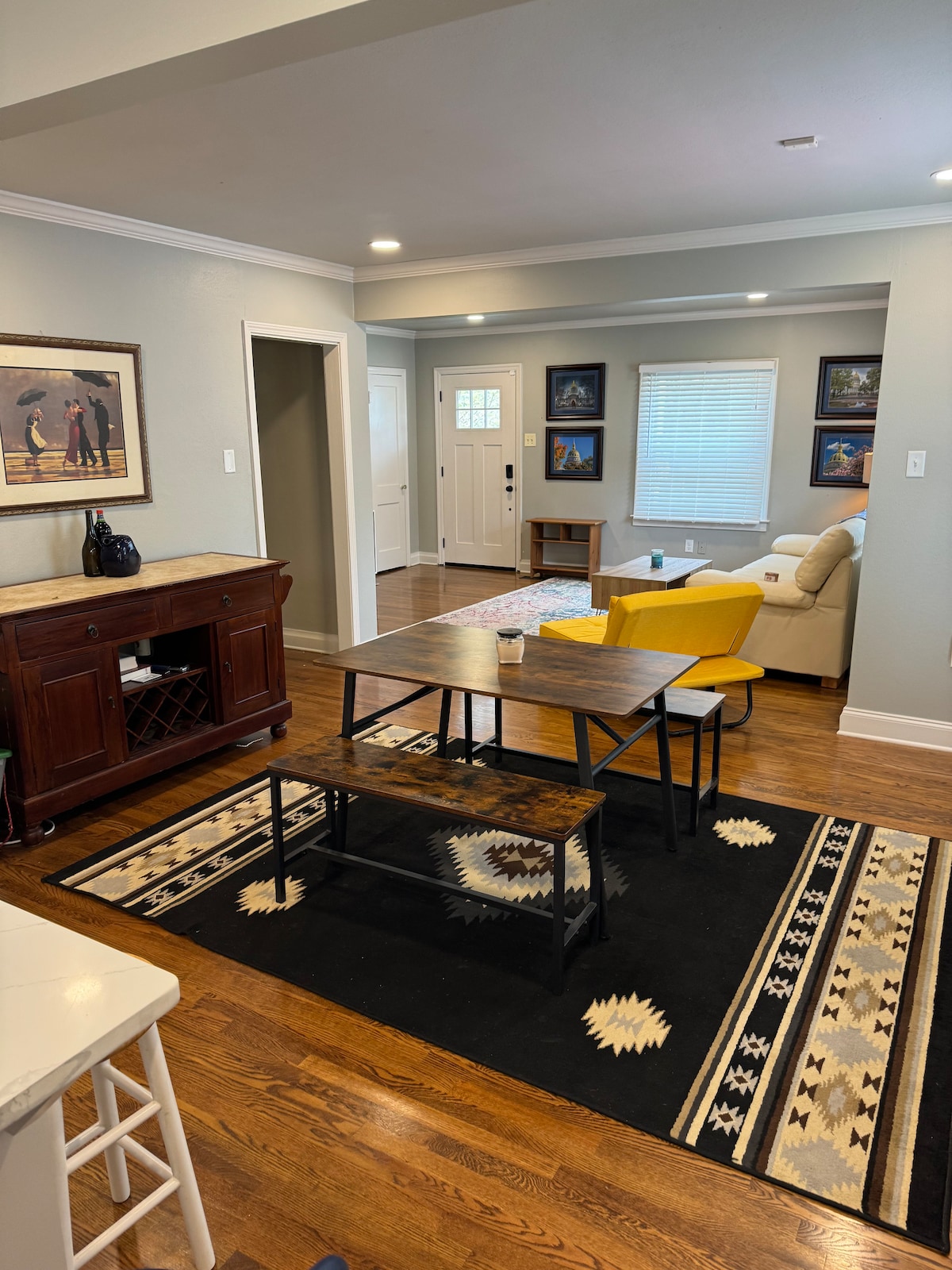 The Grackle makes SoMa easy. Most guests park when they arrive and walk to coffee, restaurants, and neighborhood spots, then come back to regroup before heading out again. Downtown and the medical district are a short drive if needed. Inside, the layout lets everyone spread out — shared living areas, a full kitchen and dining space for meals or games, a bright sunroom for a quiet office, and a screened porch for morning coffee or evening wine. Separate spaces keep different schedules easy.