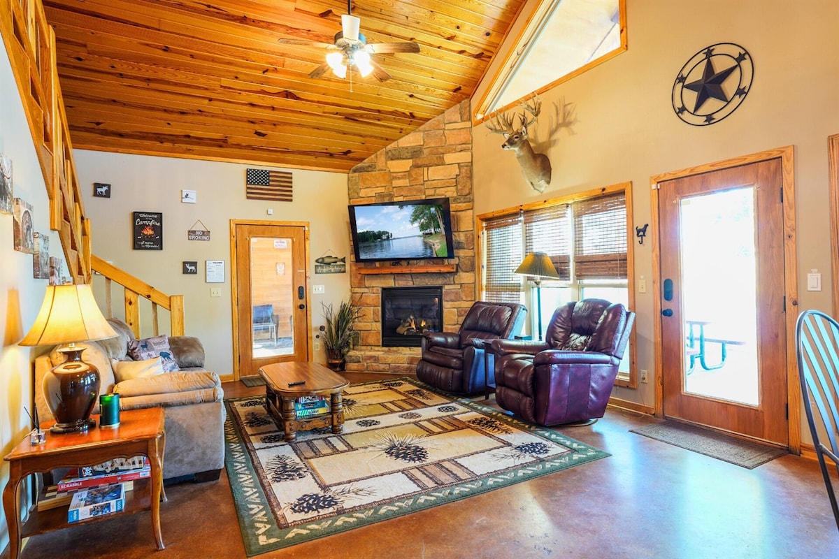 Emerald Cove: A stylish blend of rustic charm and Mid-Century Modern design, located right on the lake! Bedroom Features: Master Bedroom: Luxurious king-sized bed Second Bedroom: Bunk beds and a cozy daybed with a trundle Relaxation Spaces: Screened Porch: Two swinging hammock chairs Sectional seating Side Porch Swing: Perfect for soaking in the best lake views Hanging saucer rope swing Fire Pit Charcoal Grill 5 Cabins available, we can comfortably sleep 34