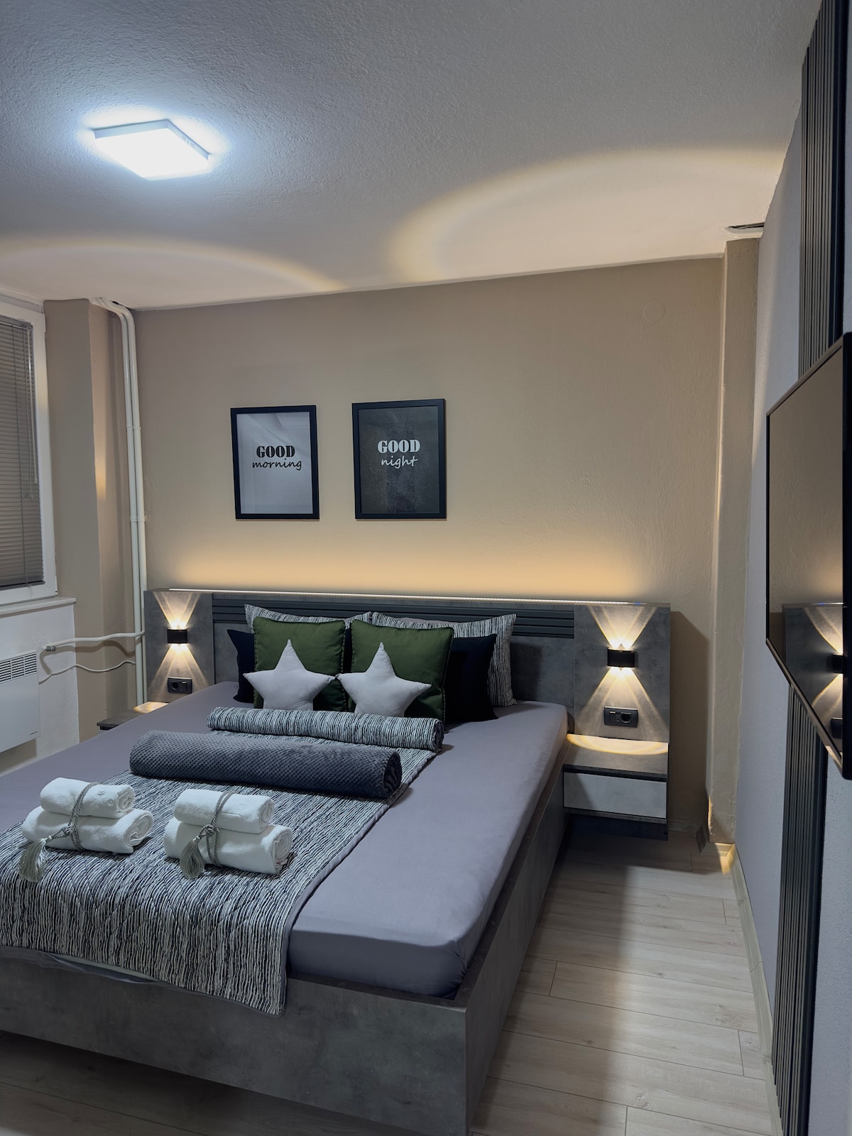 One-bedroom apartment (40m2) with new furniture, located in quiet part of the town, only 3 minutes walking distance from the lake. The apartment has air-condition; fully equipped kitchen, dining area, bedroom with queen size boxpring bed, living room with LED Smart TV, free Wifi, private new bathroom. Free private parking Ideal for couples which prefer intimacy or for families with two children