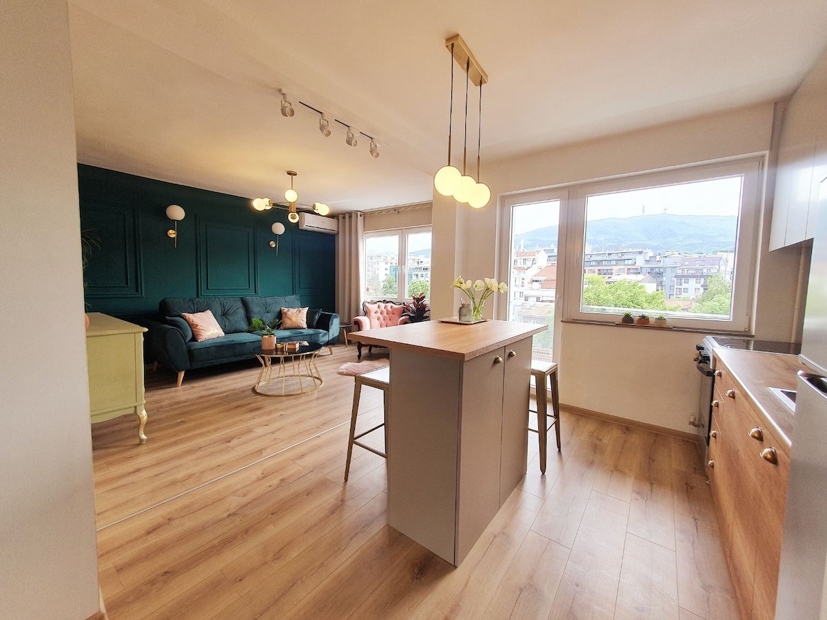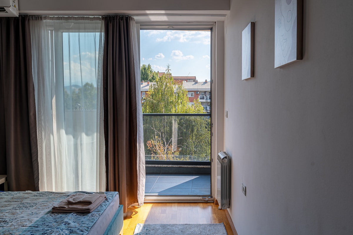 Enjoy a stylish experience at this centrally-located place This is BRAND NEW 60m2 apartment 5 minutes on foot from city park (stadium) and from the main square. Best possible location, very close to the lovely streets of Debar Maalo with many bars and restaurants. The apartment is with 1 bedroom with queen sized bed, and a living room with comfortable sofa bed + pull out bed Also 2 balconies from both rooms, one overlooking Vodno mountain. You can use it to drink a coffee or have a lunch