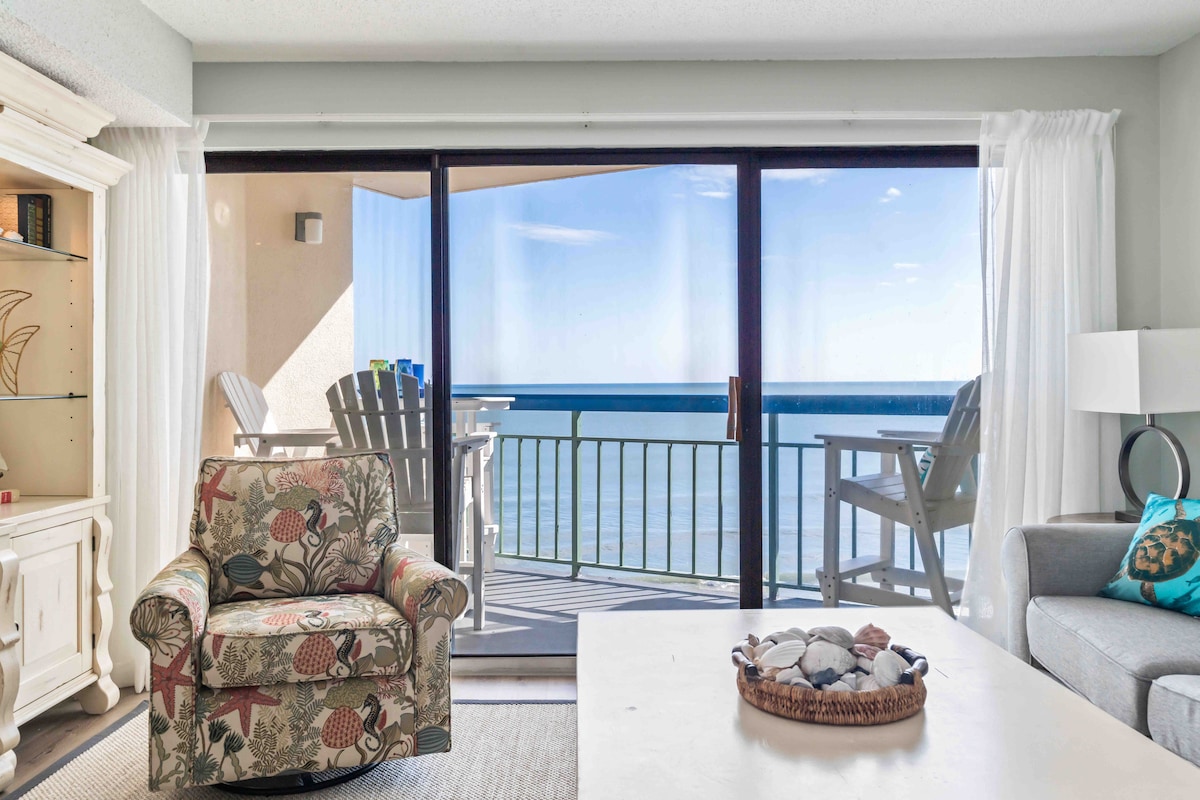 I am a proud to be a **SUPERHOST!** - Airbnb's TOP HOST Rating! This is a penthouse (11th floor) oceanfront end corner-unit located in The Oceans condo building with amazing panoramic views! There are 2 elevators in the building and an oceanfront pool with the most amazing view on the 4th floor. Location is stellar: close to grocery, restaurants, bars, mini golf, etc. Beach is wide and gorgeous here! This condo can sleep up to 9 people (8 adults and 1 baby). Fresh towels & linens included.
