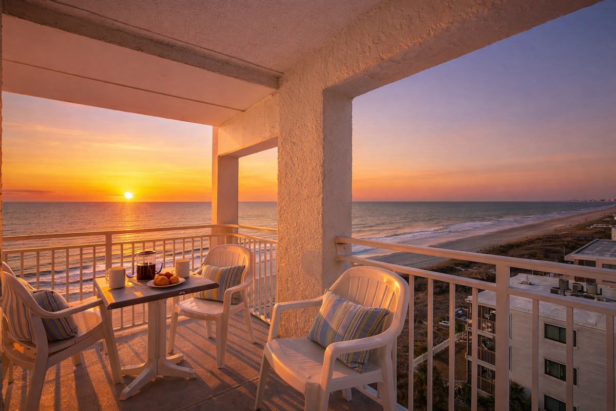 Escape to our beautiful 6th-floor beachfront condo in North Myrtle Beach! This quiet, updated end-unit comfortably sleeps 4 with a king bed and queen sleeper. Enjoy partial ocean/city views from your private balcony, a fully equipped kitchen, and resort amenities like a pool and lazy river. Just a 5-block walk to the lively bars, restaurants, and shops on Main Street. Perfect for a couple's retreat or small family getaway! Sorry. No pets. No smoking. Ring security camera at entry.