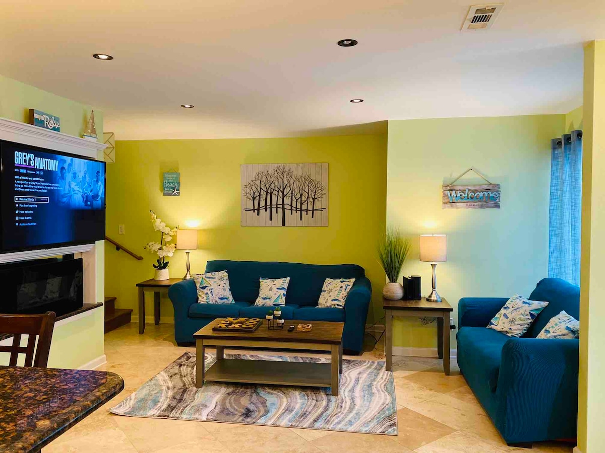 Come and enjoy this beautiful private beach TOWNHOUSE. First floor is the kitchen, living room, dining room half bath and balcony! Second floor 2 bedrooms just added roll away bed for extra sleeping with a full bath, washer & dryer and a balcony! Third floor is a master bedroom with a private bath and a wet bar, private balcony! 4 smart TV's for streaming . Private parking underneath & in parking lot. NO SMOKING. beach chairs, towels umbrella supplied. Message me for winter monthly discounts!