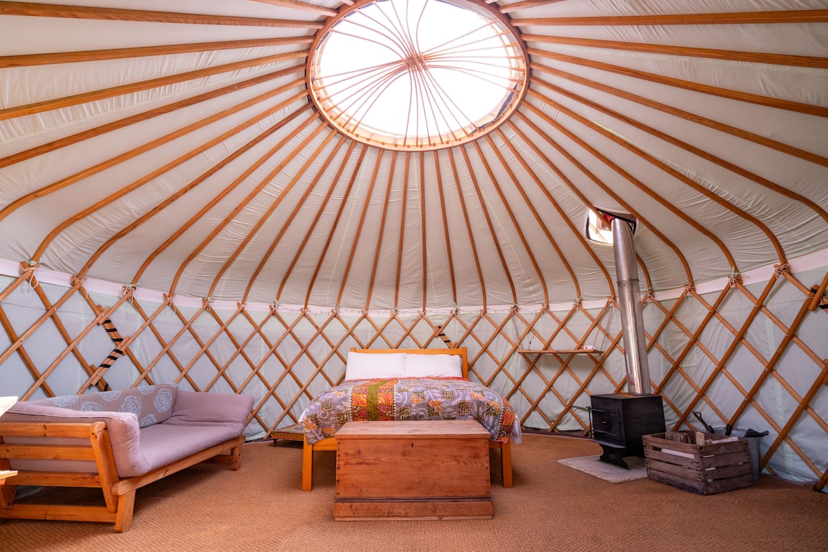 Our traditional Mongolian yurt is fleece lined, is surrounded by a wooden lattice and has a wood burning stove. This 5m diameter yurt can accommodate up to 4 people. It is 5 mins walk from the cliff top and 10 mins from the beach. There is an outdoor undercover eating area with a gas burner, fridge/freezer and picnic table. The yurt is equipped with everything you need for your stay. There is access to all The Grove facilities - swimming pool, play area, massage hut, bar and restaurants.