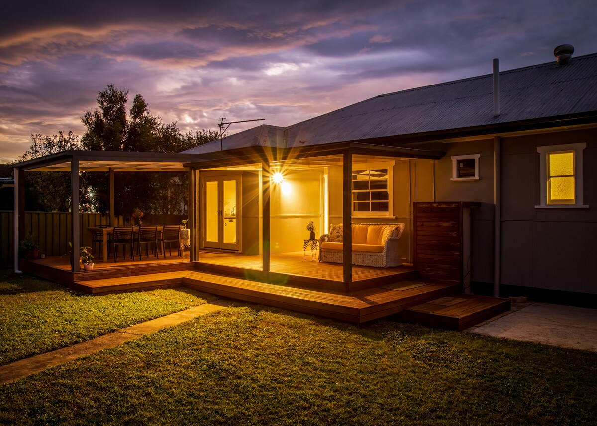 • Luxe, romantic cottage • Professionals: fast NBN WiFi, desk • Families: full kitchen, large yard, next to park and walks • Pet Friendly: with large, shady fenced yard. Audrey's is a freshly renovated, stylishly presented two bedroom cottage in the historic area of Nowra. It sleeps 4 people and is a short walk to the shops and cafes. Shoalhaven Hospital is just up the street and its ideal if you are attending a wedding in the Berry/Nowra area. Kids welcome -cot and highchair (by request).