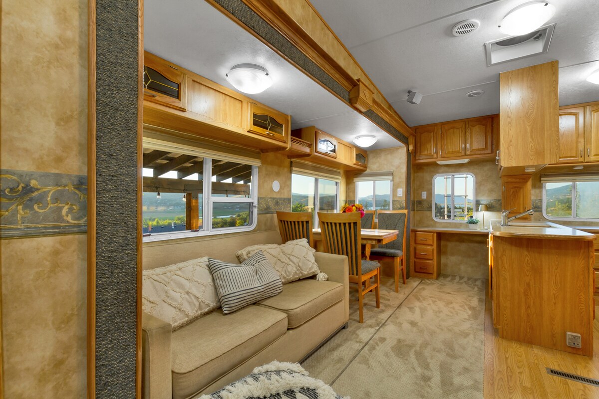 The Redwood is perfect alternative a hotel and to have your own space for stays in the Okanagan. Just have a place to park it and I will arrange delivery set up and pick up. You’re going to love the unique layout of this 5th wheel. The front kitchen/living area features dual opposing slides, creating a large space to watch tv or prepare all your meals while you are away from home. The top slide has a private bedroom with a Queen bed.