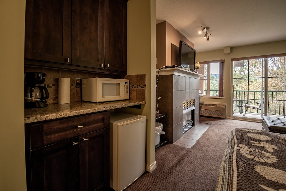 This condo will make you feel at home while vacationing. The kitchen has everything you need for a delicious meal, with a full size fridge and stove plus all your dishes and utensils! This space features unique fixtures such as a built in wall dining area, grey toned walls, and an in-suite fireplace. This space offers a trendy yet classy feel. The gorgeous patio features a barbecue and dining table for 2. Enjoy a glass of Okanagan wine or craft beer while sitting on the large outdoor patio.
