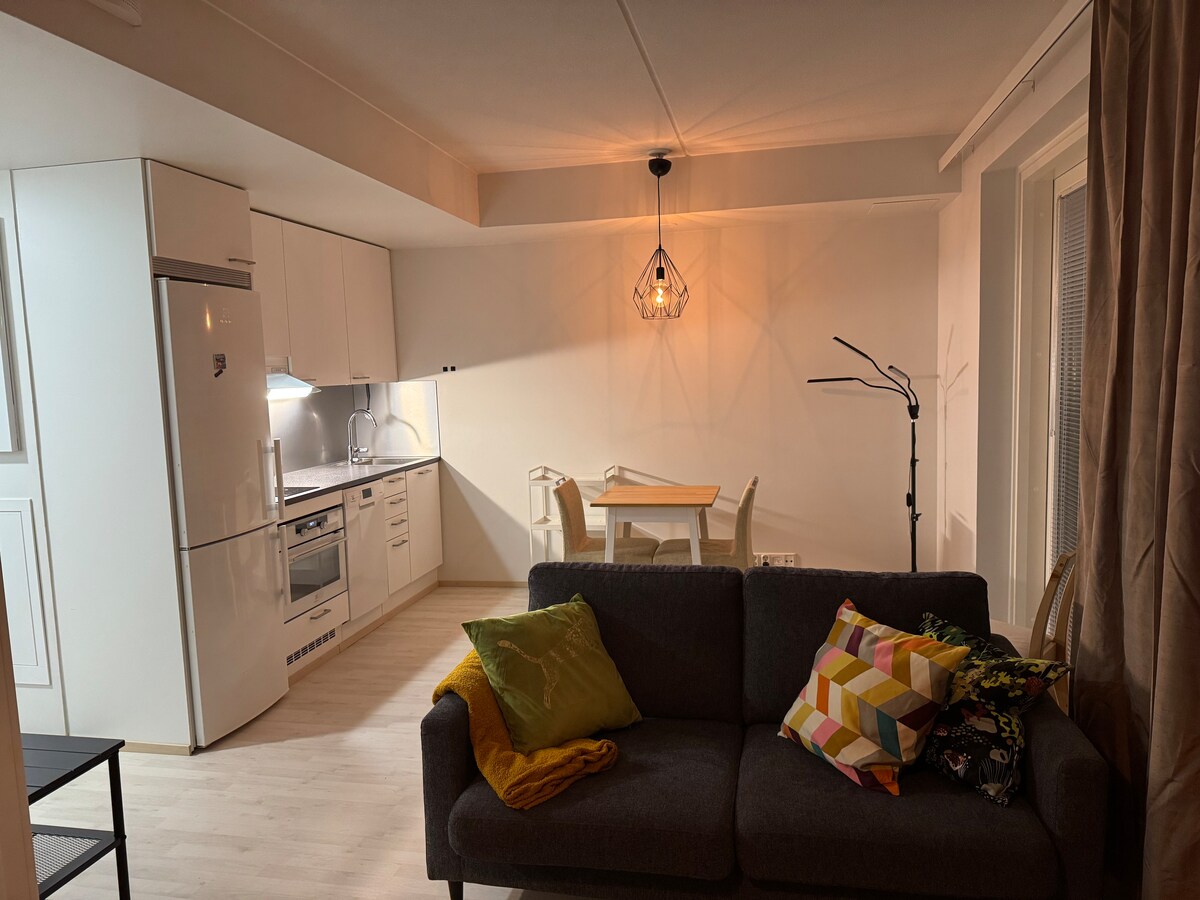 Modern 47.5sqm one-bedroom apartment just 10min walk to downtown. Easy access to public transportation and all the amenities the city offers. The apartment includes fully equipped kitchen, 49" UHD Smart TV, fast Wi-Fi and own Sauna! In the bedroom there is queen size bed and in the living room 80cm extra mattress. Apartment is good for groups of 3 people! Parking in warm garage. Possibility to charge EV for 20c/kwh.