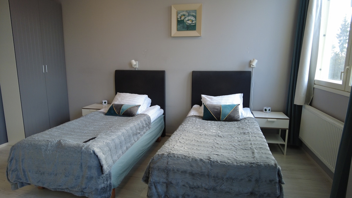 Experience the beauty of Posio, Finland, from our cozy Twin Room with Terrace. This inviting retreat offers two comfy beds and a private terrace with stunning lake views, perfect for your morning coffee. Enjoy the convenience of an electric kettle, heating for cozy evenings, and a modern walk-in shower in the private bathroom. Perfect for travelers seeking peace and a close connection with nature.