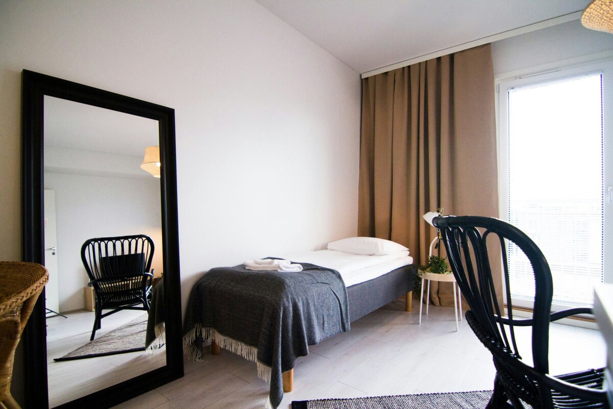 Modern apartment in Toppila-district, perfect for long or short stays. Located in the beautiful Toppilasalmi area, just 3 km from Oulu city center. Features a spacious bathroom, fully equipped kitchen, and a large glassed balcony. Towels, linen, and WiFi included.