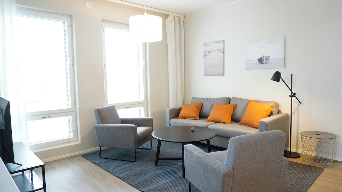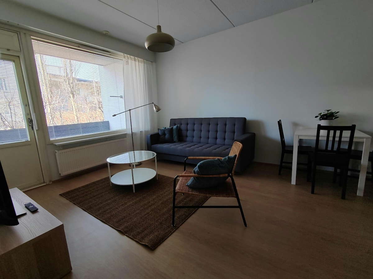 Nice two-bedroom apartment in the center of Kokkola. Features a fully equipped kitchen, light living room with TV, sofa, and armchairs, and a bathroom with a washing machine. Includes a balcony. All city center services within walking distance.