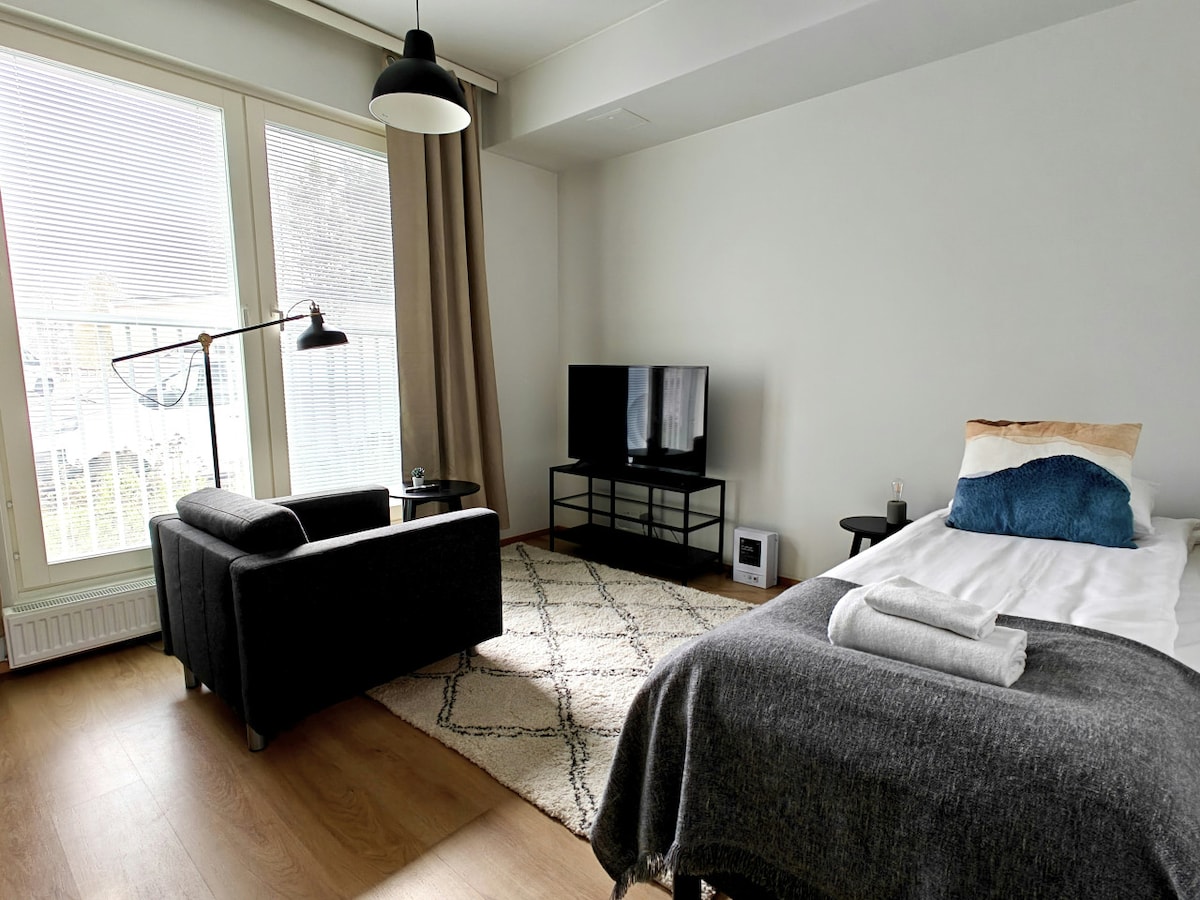 Cozy 22m² studio in Oulu, ideal for solo travelers. Located on the first floor, it features a well-equipped kitchen, washing machine, and access to a gym and social space. Includes bed linen, towels, and internet.