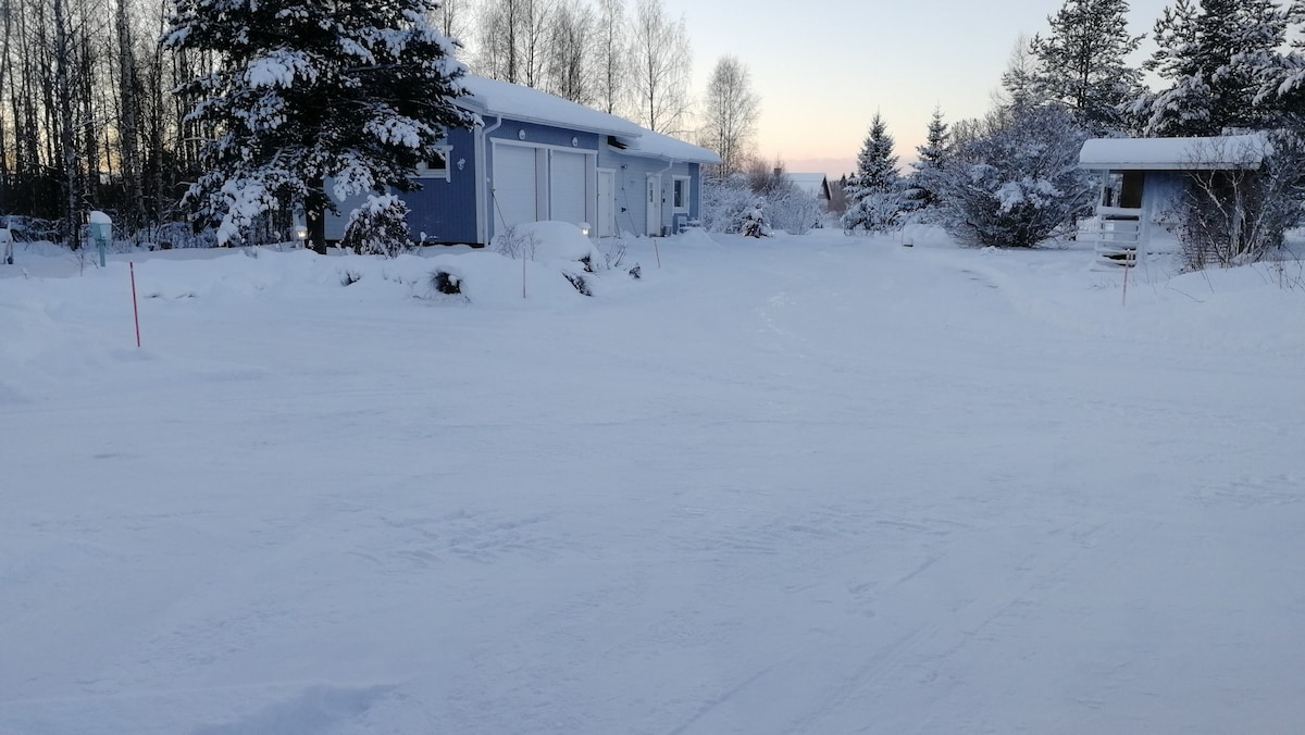 Our wooden cottage is located in idyllic residential neighbourhood. It is 2,5 km from downtown! Easy to access! It is a charming high-quality cabin for 3. Kitchen and large bathroom with sauna. Relaxing and peaceful residential. Laplands university and supermarket is within a 500 meter. Two kicking sledges free for use. The longest river Kemijoki is only 50 m away. Our family lives on the other side of the garden so you can enjoy genuine Finnish lifestyle here. We wish you warmly welcome!