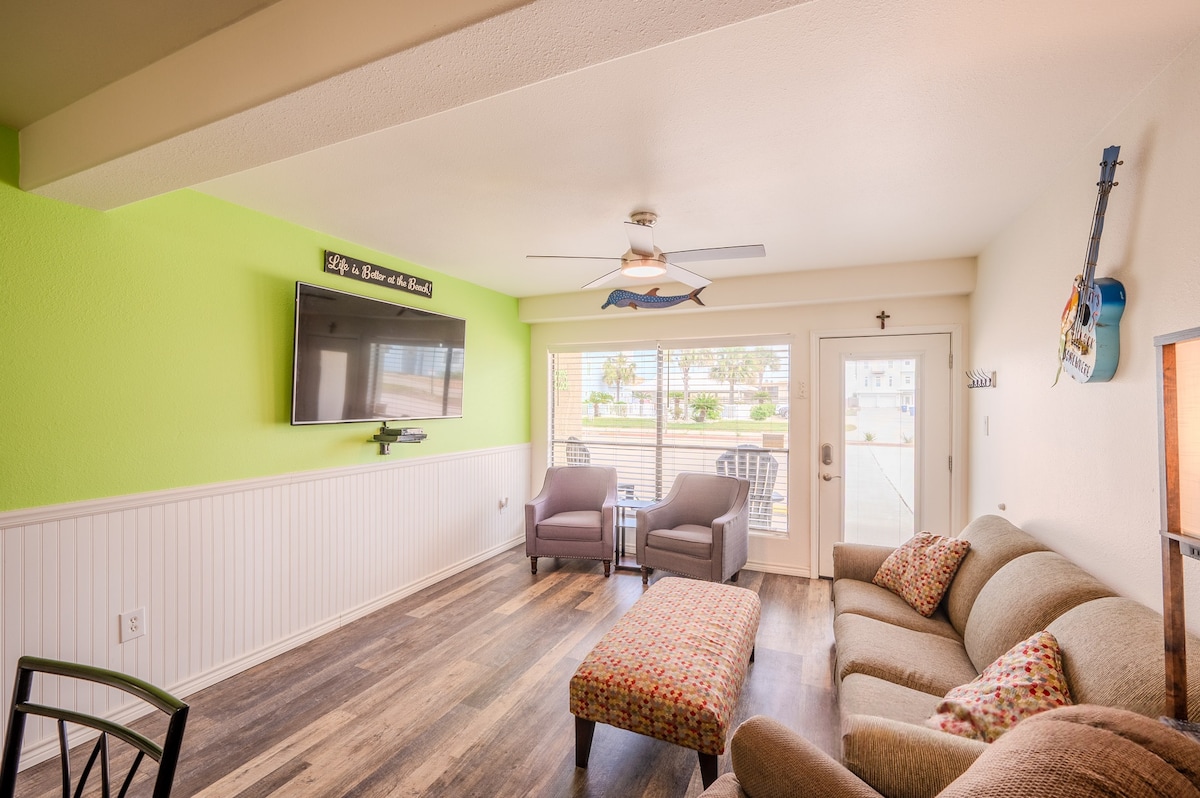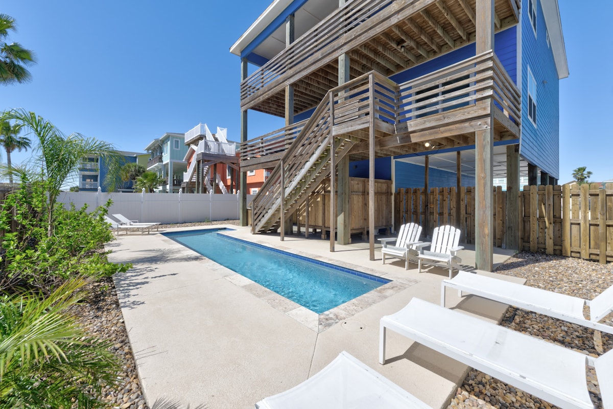 Come make memories at this unique, family-friendly oasis! This retreat promises a luxurious beach vacation! Upscale living, this is simply the finest house in Port Aransas. ~Free Golf Cart ~Very close to the beach ~Private Heated Pool ($50 per day additional cost to heat the pool) ~Fire Pit with wood and s'mores included (November to April) ~Located in the quiet part of town ~Walk to all the restaurants ~Huge outdoor TV with Sonos Soundbar ~Lawn games (Cornhole, Mini Golf) ~Keyless Entry