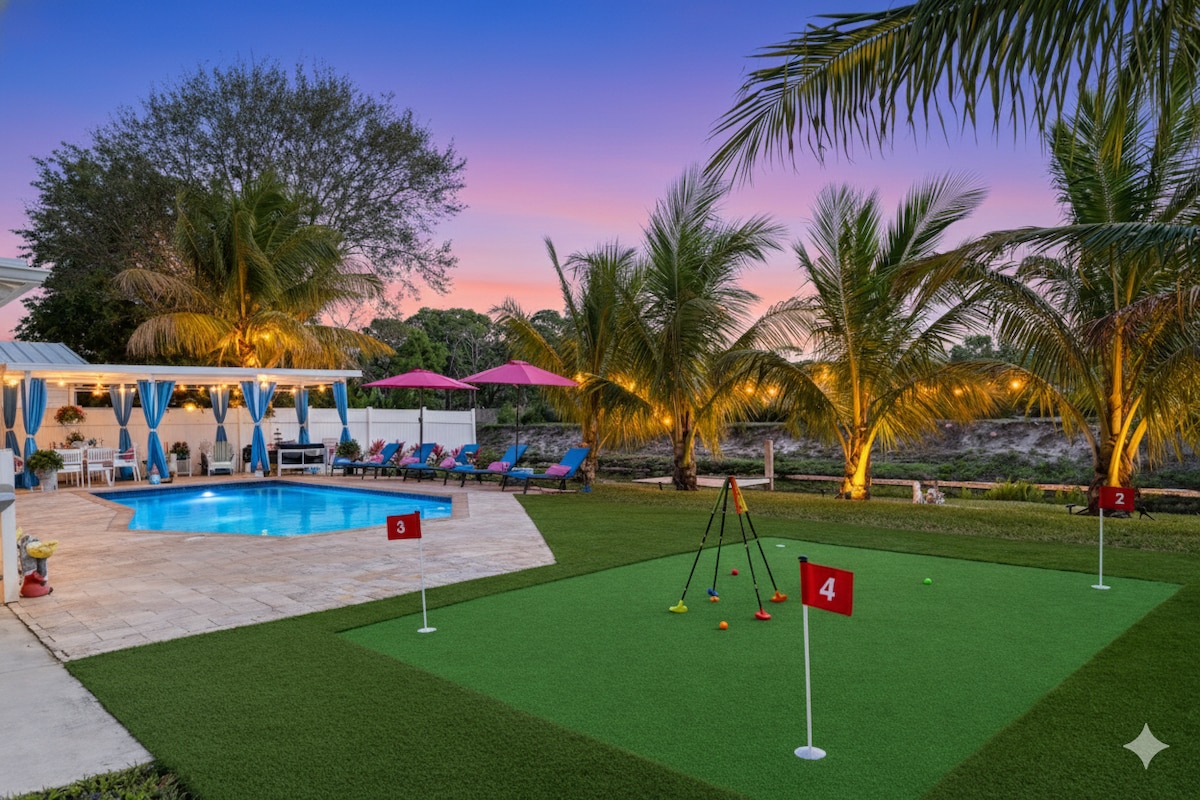Drift Inn – Welcome to your own slice of waterfront paradise in Palm Beach County! This spacious lakefront escape sleeps 14 and is packed with resort-style amenities: unwind in the hot tub, perfect your swing on the putting green, or fire up the grill at the outdoor kitchen/bar. With stunning Lake Osborne views and sunsets that steal the show, every inch of this home is designed for fun, comfort, and connection. The perfect setting for families, friends, and unforgettable memories.