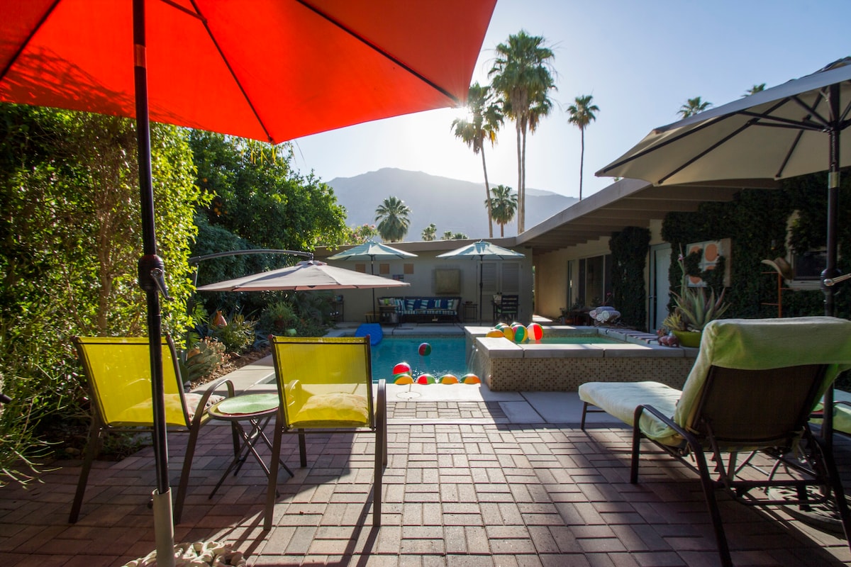 Welcome to Palm Peach, a Wes Anderson-inspired desert fiesta filled with colors and characters, perfect for 8 guests. Sun bathe on handmade lounge chairs by the pool in a resort-style backyard. Dip in the large saltwater pool. Enjoy a hot spa under the stars. Or gather around the fireplace to ward off chills. Experience a most unique blacklight game & theater room with a blacklight mural, an 8ft pool table, karaoke, Simpsons arcade & more.
